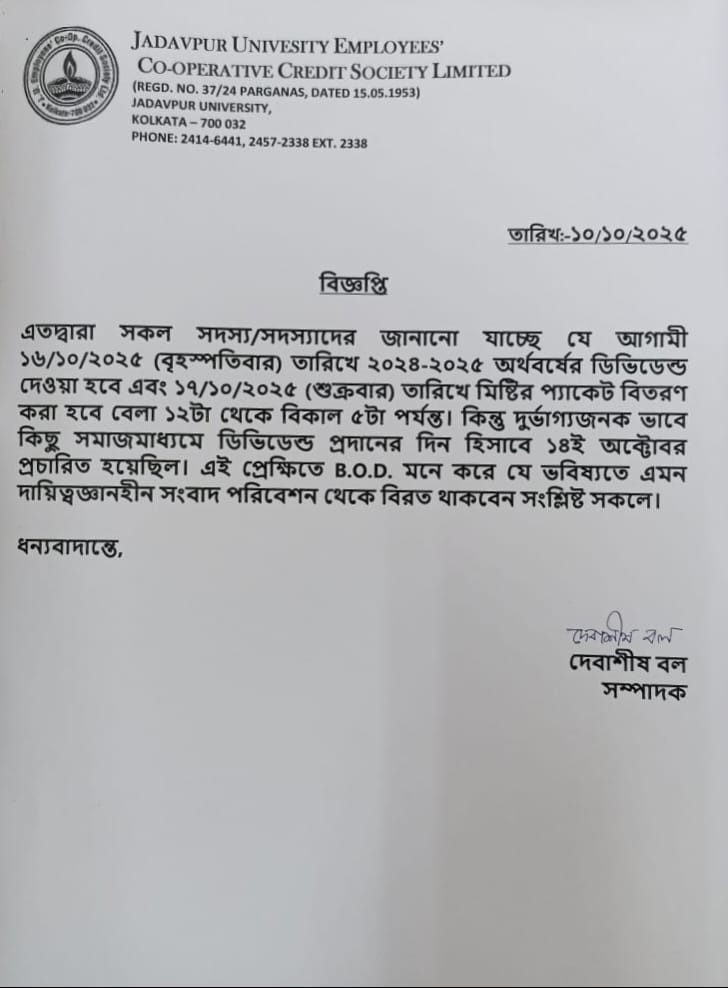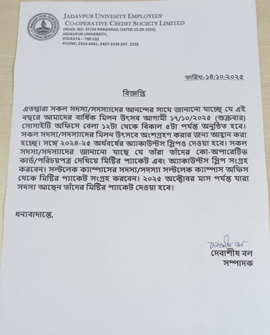 Under the Chairmanship of Dr Trigunacharan Sen, the then Rector of National Council of Education, Bengal in a meeting on 10th October 1951 “The National Council of Education Employees’ Co-operative Credit Society Limited” has been formed for the welfare benefit to all the employees. Professor Hemchandra Guha was appointed as the Secretary of the Society. Professor Hemchandra Guha with Professor Dr Sudhansu Kumar Banerjee, Shri Prabir Chandra Vasu Mallik and Rector Dr Trigunacharan Sen tried to form a registered Credit Co-operative Society so that all the employees can form a fund by contribution & get loan at the time of their urgent needs.